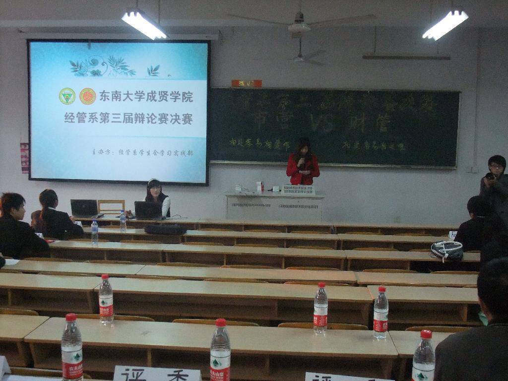 2010年10月28日下午4:30,由经济管理系学生会学习实践部主办的第三届经济管理系辩论赛决赛在文昌院203教室正式举行。系党总支书记黄苏宁和系分团委书记羊栋及相关专业辅导员应邀观看本次比赛。本次辩论赛决赛的评委有第二、第三届经济管理系分团委学生会联席会成员,第二届经管系学生会学习实践部部长以及系辩论队主力成员。