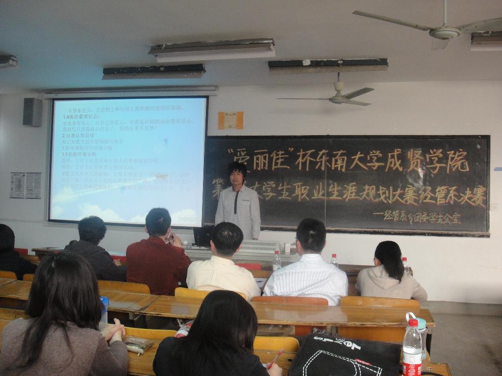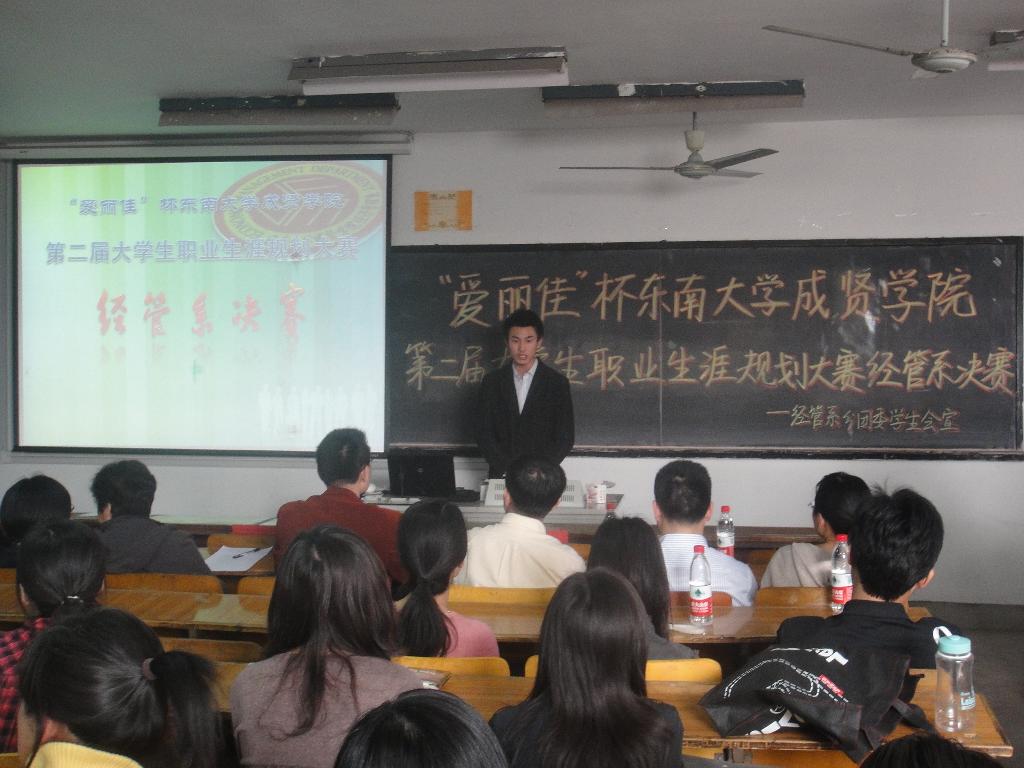 2011年4月28日,下午四点整,在成贤院513,由经济管理系分团委学生会主办,学习实践部承办的pg国际电子网站pg国际电子网站第二届“爱丽佳”杯职业生涯规划大赛经济管理系决赛系决赛拉开帷幕。莅临本次比赛的嘉宾及评委老师有经济管理系党总支书记黄苏宁老师,经济管理系学办副主任李清源老师,经济管理系分团委书记羊栋老师,,母雪梅老师,徐小瑛老师,李桂清老师,以及南京业祥科技发展有限公司市场总监、转折号(中国)教育咨询有限公司特聘讲师许金金先生。
