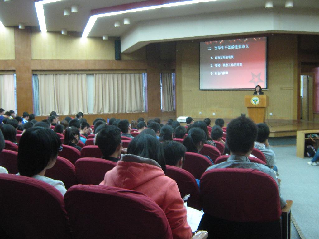 李清源老师首先给大家带来了精彩而深刻的演讲。她在讲话中指出:“做学生干部的意义,不仅在于满足自身发展的需要,更是为了适应学校、班级,乃至将来社会工作的需要。”李清源老师尤其强调:“作为一名学生干部,一定要协调好人际关系,充分调动其他干部和同学的主动性、积极性。在处理好学习、工作和休息关系的基础上,积极参与学生管理,参加学生活动,为同学树立起良好的榜样,并成为联系同学和老师的纽带,从而更好地为同学和老师提供全面细致的服务。”李清源老师的讲话使新生干部端正了自己的角色定位,明确了自己所担负的责任,也为他们即将开展的学生工作打了一剂强效针。