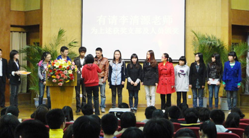 李清源老师首先宣读了《经济管理系2010-2011年度社会活动优秀学生团队表彰决定》,授予“用友杯”第七届全国大学生创业设计暨沙盘模拟经营大赛总决赛三等奖获奖选手“2011年度ERP团队精英”称号,授予江苏省第六届大学生职业生涯规划大赛获奖选手“2011年度职业规划之星”称号,授予江苏省教育厅“大学生实践创新项目”立项申报团队——甘肃漳县支教小分队“2011年度实践创新团队精英”称号。随后,获奖学生的辅导员们为获奖选手颁奖。