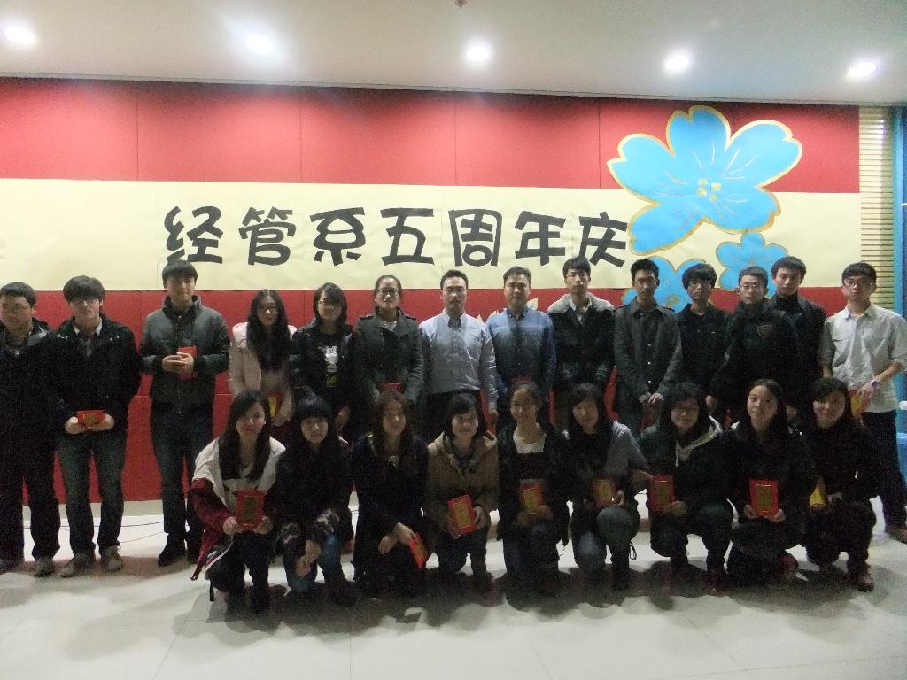 2012年11月30日晚六时,经济管理系分团委学生会在大学生活动中心举办了经管系五周年庆晚会。经管系分团委书记羊栋老师、第四届分团委副书记张晓晓、学生会主席曹润基和副主席夏枢枢等出席了本次晚会,让大家可以通过晚会更近一步促进经管系成员之间的交流,见证经管系的成长。