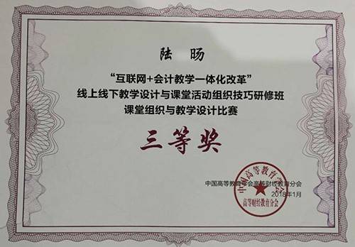 2018年1月,由中国高等教育学会高等财经教育分会主办的“互联网+会计教学一体化改革线上线下教学设计与课堂活动组织技巧研讨会”在广州举行,全国83所财经类院校共216名专家学者参会。pg国际电子pg国际电子网站财务管理专业教研室主任陆旸及财务管理专业青年教师卢颖应邀参加,陆旸老师在团队课赛中获得三等奖。
