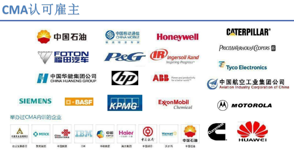 IBM、摩托罗拉、强生、奥姆尼康(Omnicom)、中国电信、中国平安集团、兵器工业集团、南车、中国核电等国内外知名企业均组织员工参与CMA培训与认证。
