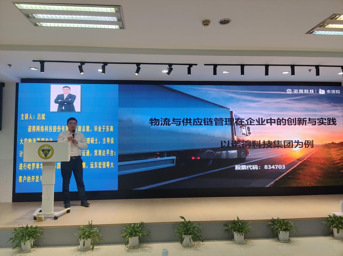讲座中,吕斌副总裁从物流与供应链相关理论出发,分析了国家政策、行业发展、物流组织模式等宏观物流环境,以诺得网络科技股份有限公司的物流与供应链管理的探索与实践为例,深入浅出地向同学们分析了物流与供应链发展前沿,企业如何通过创新突围,构建敏捷、智能、韧性的现代供应链体系,满足瞬息万变的客户需求及低碳可持续发展的要求。吕总还和同学们分享了自己的求学和工作经历,市场对物流与供应链管理人才的要求,为同学们在专业方面的发展指明了方向。